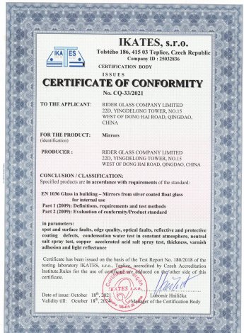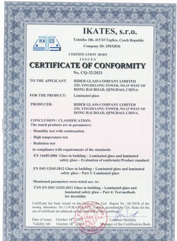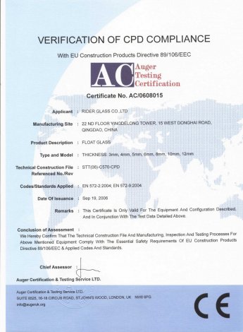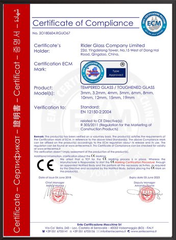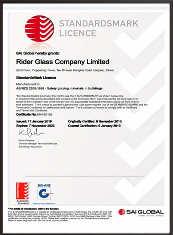 Rider Glass has its own joint venture factory and all products produced by it have passed various international certifications, including AS / NZS 2208: 1996, CE CERTIFICATE, SGCC, etc.,
